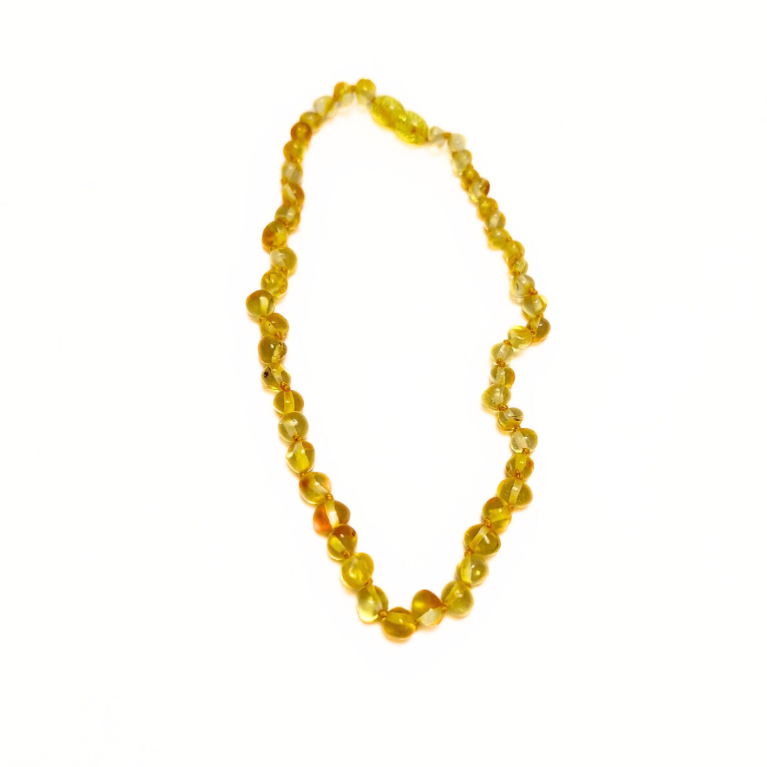 Baltic Amber Teething NecklaceNatural Baltic Amber is formed from fossilized tree resin dating back 45 million years. It contains succinic acid reported to have anti-inflammatory and analgesic qualities. It's a natural remedy reputed to boost the immune system, soothe inflammation, and accelerate healing, especially when teething.HOW IT WORKS: Baltic Amber releases succinic acid when worn and warmed by the skin renowned for creating a healing electromagnetic field. BENEFICIAL FOR: Analgesic effect on sore or swollen gums Enhances frame of mind Reduces irritability Reduces inflammation Improves sleep BALTIC AMBER BABY NECKLACE: 31 - 34 cm, screw clasp.Clears red cheeks100% certified Baltic amber. WARNING: NOT FOR CHEWING. Not to be worn by children under the age of three years without adult supervision. Necklace can also be wrapped around the ankle. CLEANING INSTRUCTIONS: Wash with warm water, sun dry or dry with soft cloth. DISCLAIMER: Necklaces are designed to come apart when pulled too hard or forced beyond that of normal use. Necklaces are made with extra thick thread and a knot is tied after each bead so in the event of breakage, individual beads do not get released.