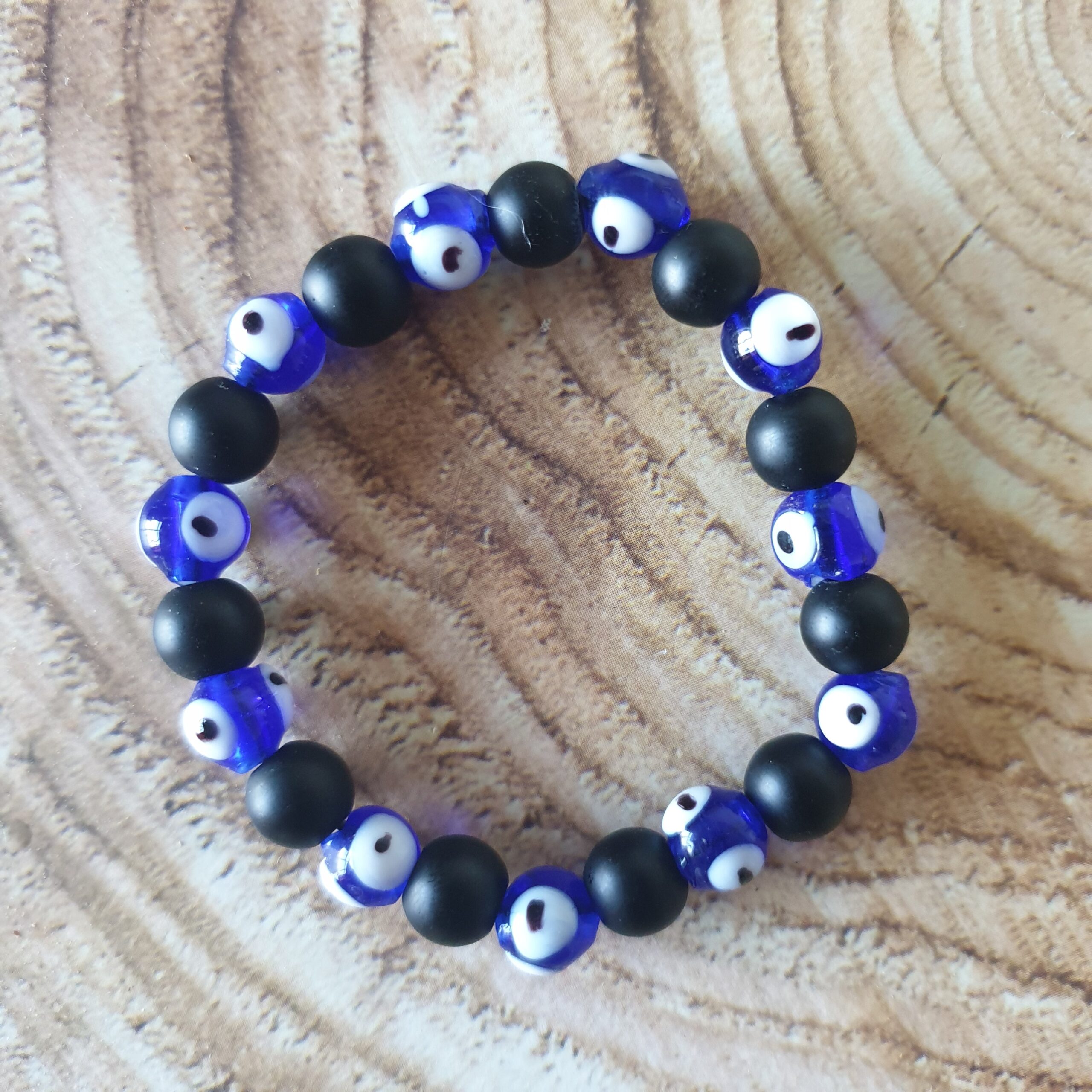 Safeguard your energy with the Matte Agate Evil Eye Bracelet. This modern, 8mm accessory combines the velvety, grounding texture of Matte Black Agate with a vibrant glass evil eye. Designed to deflect negativity while keeping you centered, this flexible elastic bracelet acts as a powerful daily anchor for spiritual shielding and inner stability.