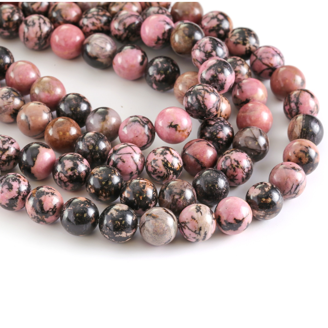 Discover the striking beauty of our Rhodonite 8mm round beads, a stone that perfectly balances feminine charm with earthy edge. Named after the Greek word rhodon (meaning “rose”), Rhodonite is famous for its distinctive “black-on-pink” appearance. It features a beautiful opaque rose-pink base shot through with dramatic, dendritic veins of black manganese oxide.